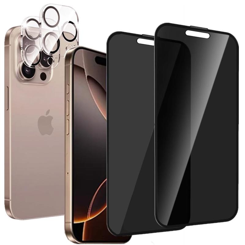 【360°覗き見防止 2+2枚セット】iPhone 16 Pro用 ガラスフィルム(2枚) + カメラフィルム(2枚) iPhone16 Pro 覗き見防止強化ガラス 360°覗き見防止 上下左右 プライバシー保護 日本製素材旭硝子製 Face IDで、