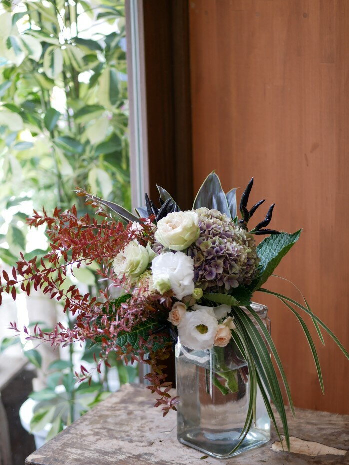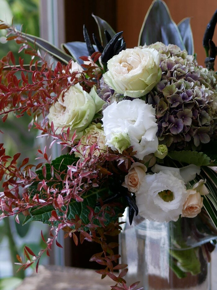 商品説明使用花材 あじさい、バラ、トルコキキョウ など※紅葉は秋限定です。